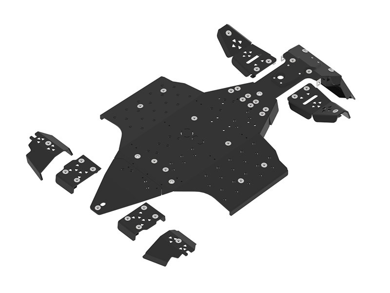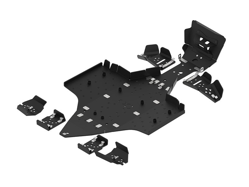 Protects the whole bottom and front part of the chassis and front & rear A-arms.Additional, bolted front part reinforcement plate.Pre-cut sectors for finishing the optional rib shaped holes for mud draining.Holes for oil changing.Original tow loop is covered with skids, additional cut into skid plate front parts needed if want to use the loop.Front lower part of the skid plate must be removed in order to use the Polaris OE ‘Glacier III’ snow plow system!All fastening parts and fitting instruction are enclosed.