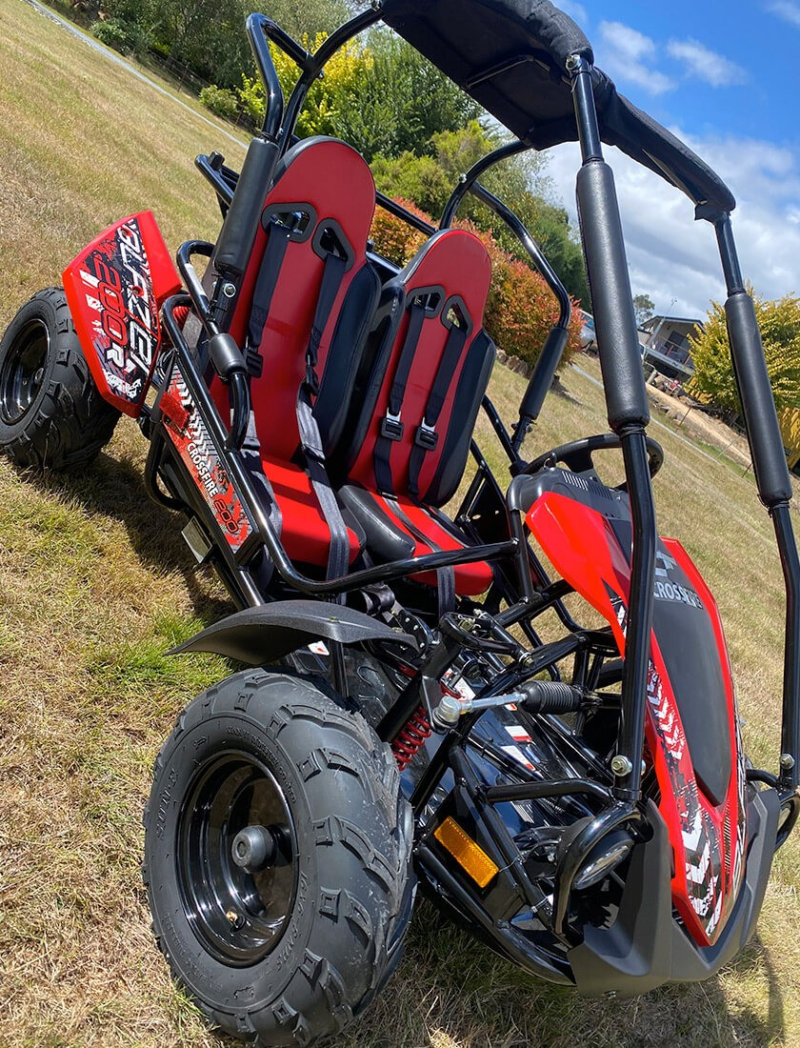 TRAILMASTERS newest mid-size kids go-kart featuring the latest innovations in off-road buggies. Produces excellent power and low-end torque. Comfy sport bucket seats with 5 point harness for safety.