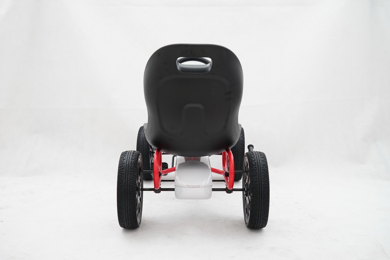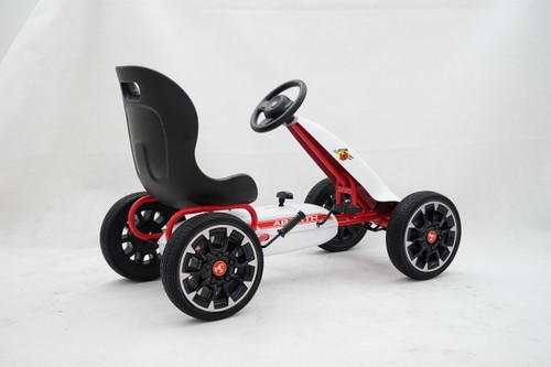 Complete with freewheel our Abarth pedal go kart can switch to freewheel mode so the pedals don’t move while the wheels are moving or going down hills. The robust metal frame comes with a stylish front spoiler and all 4 wheels are made of EVA rubber for a smoother ride.