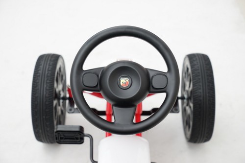 The Large black bucket seat has 3 adjustable positions making it perfect for kids of different height from the ages of 3-8 years. A sporty steering wheel with official Abarth logo makes the go kart easy to handle and turn while the nearby hand brake makes it easy to stop if needed.